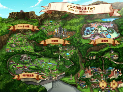 遊戲世界被分為四塊區域, 三大勢力(ハートの城、帽子屋屋敷及遊園地)互相對抗地想增加領域範圍,而中間的時計塔則是唯一一個中立地帶。不過這個遊戲沒有要アリス爭奪領地的要素,這個設定只是在於互勢力的角色關係上而已(當兩個不同領地的好感度到達某程度會有特殊劇情,真的還挺有趣的XDDD)
